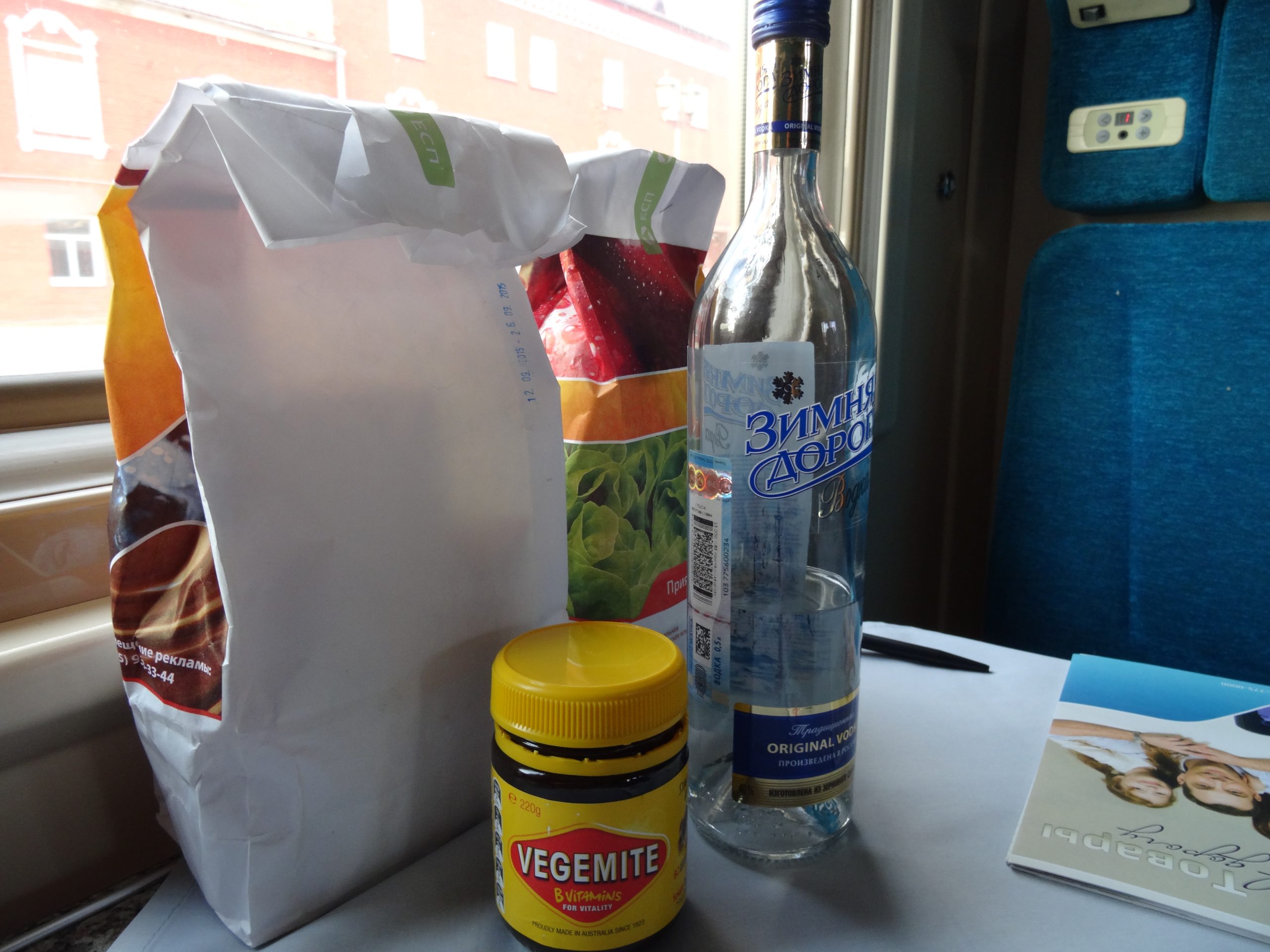 We placed these on the table of our sleeping compartment as the train was exiting Moscow station. Just as we were taking the photo, the providnista carriage attendant appeared and admonished us. “Put away vodka”, she shouted, ” you no drink”. Or, words to that effect.