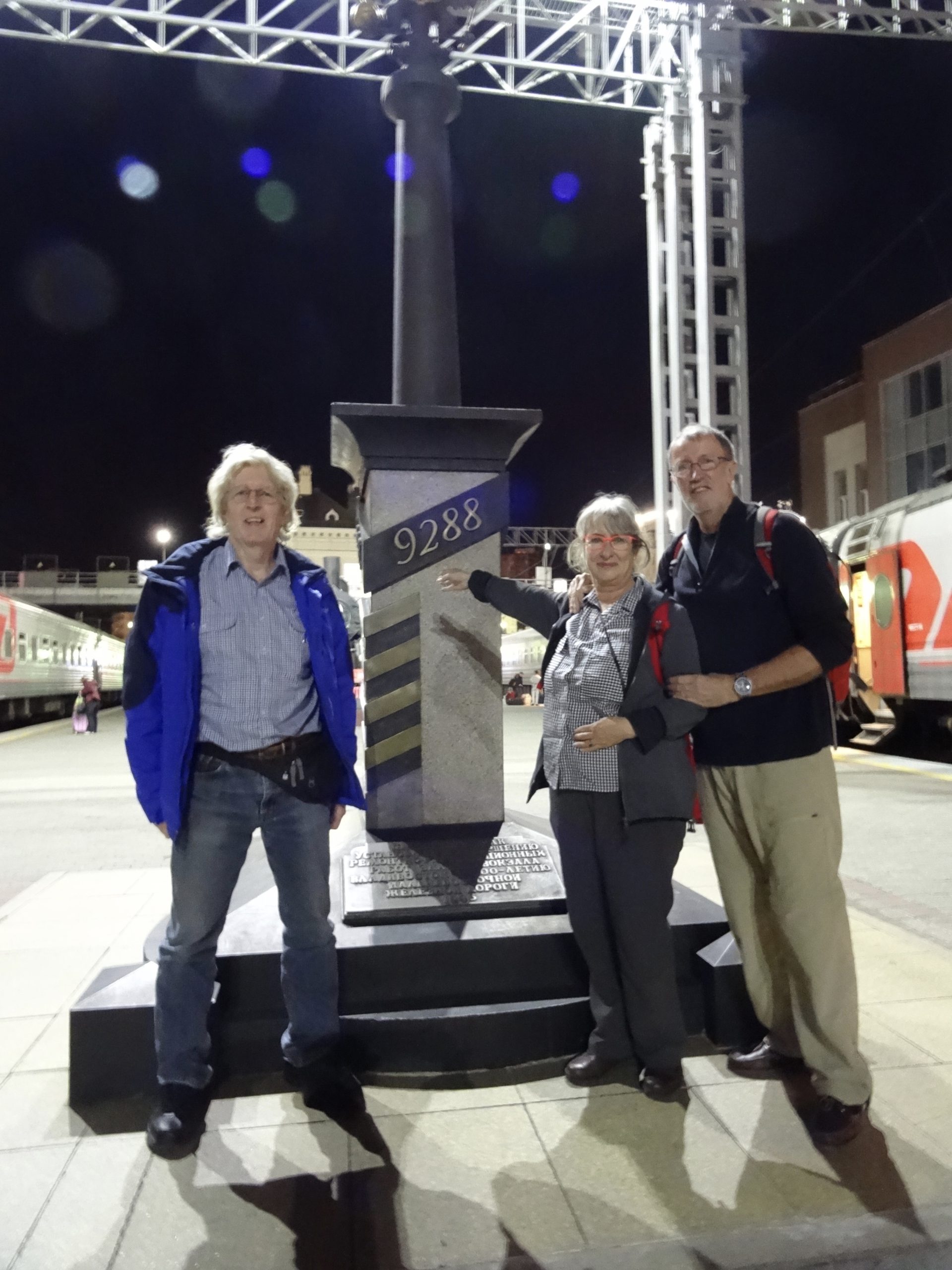 Ours began at Moscow’s Yaroslavsky Station at the Zero Km mark of the longest railway line in the world. Simon and John in front of the two joined locamotives at the fron of a very long line of carriages.